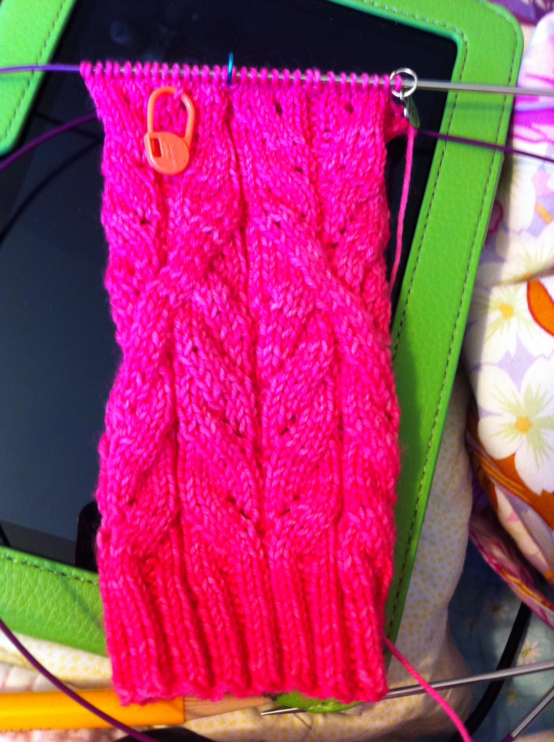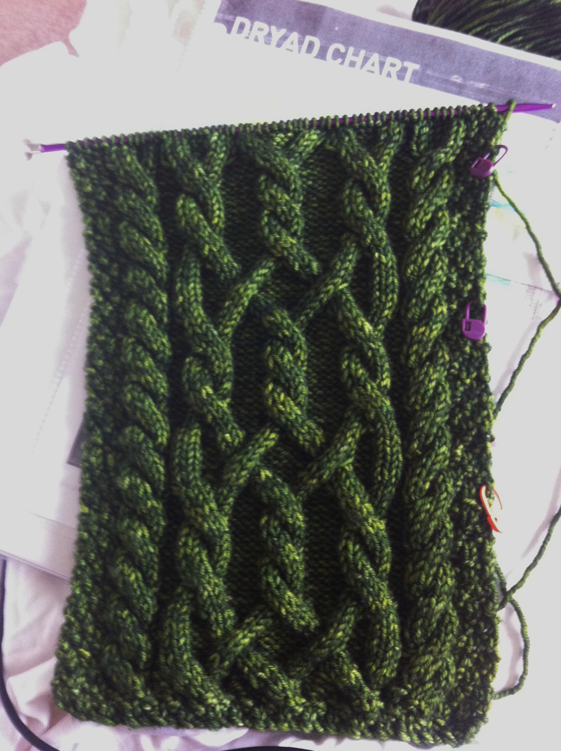 I needed a break from socks so to complicate the matter further, I cast on the Dryad Scarf by Brooklyn Tweed. Gorgeous cables that look complicated but are not so much. Just cabling on every right side row, with a total of 60 stitches.