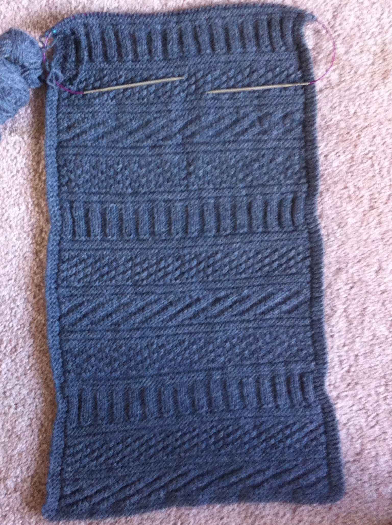 Also, I have yet another languishing scarf. This is the Guernsey Wrap, another Brooklyn Tweed Scarf. I started this sometime last spring and knit on it until the heat became unbearable. I am knitting with Paton’s Yarn. I used only coupons to buy the yarn. This was a bargain. The yarn is a bit rustic I know, but that is how I saw this scarf to be. I am half way done now. A really easy and repetitive knit. Relaxing. My picture appears a bit bluish, but it is really a beautiful granite grey.